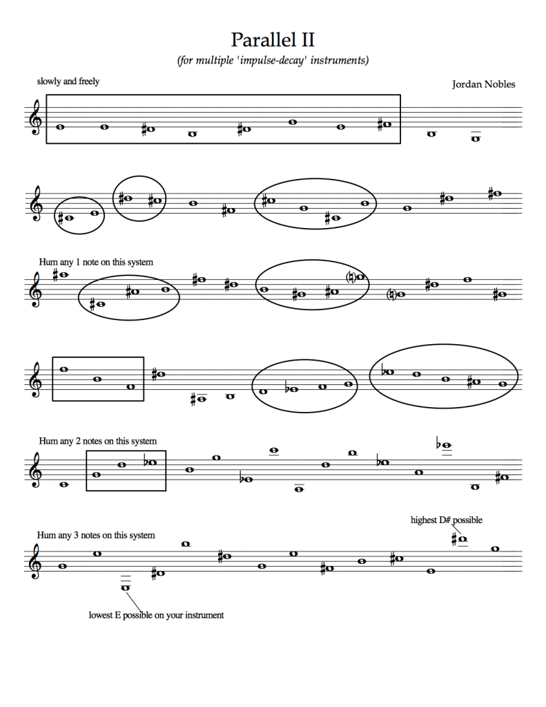 Parallel II (1997) – for any number of attack/decay instruments (piano, harp, guitar, vibes, etc..)